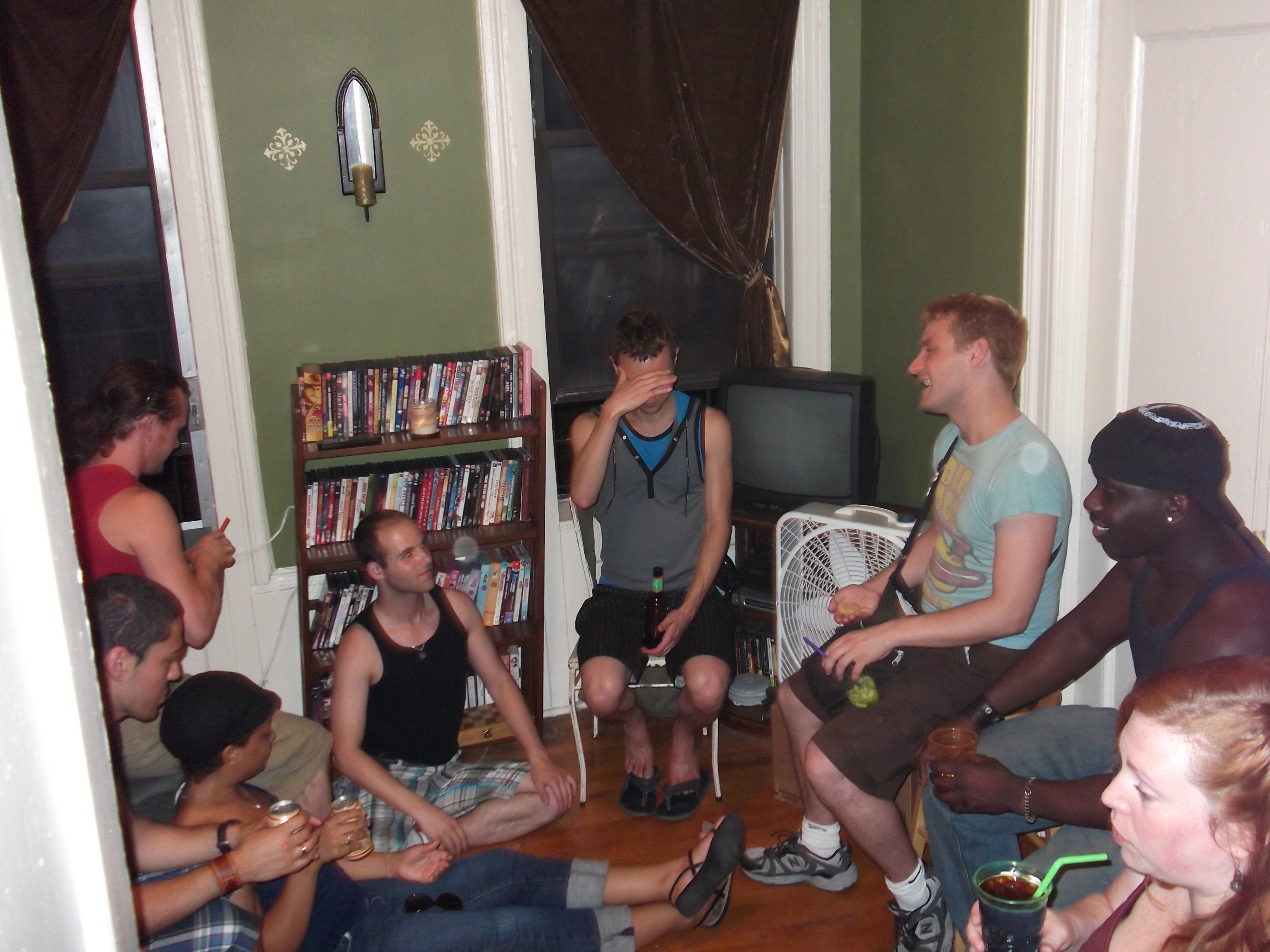 light breeze.  Everyone stood and chatted and watched the fireworks, then chatted.  And after what seemed like at least 30-45 minutes later we all made it back down the stairs and inside the oven that is our apartment. Pizza was ordered and people were still drinking and now we were dancing to Lady Gaga in the kitchen.  Rabekah Pearl came over.Hadn’t seen her in a couple years, since Lightning in a bottle – she had met adam-from-the-band-i-brought-home.  hahaha.  sigh.  Anyway.  She came over and we drank, and chatted and I found out she lived in I